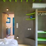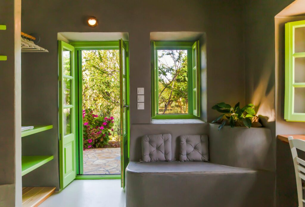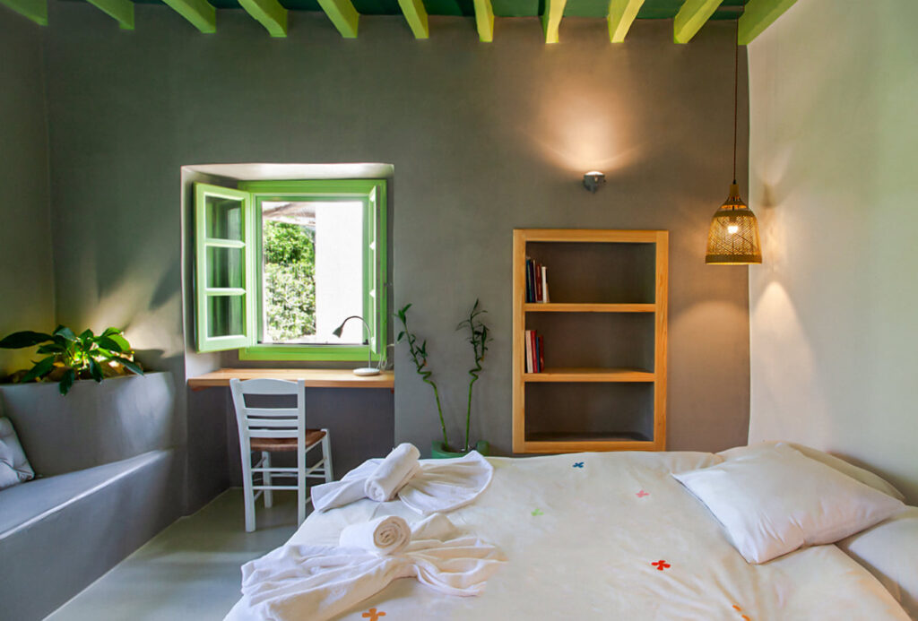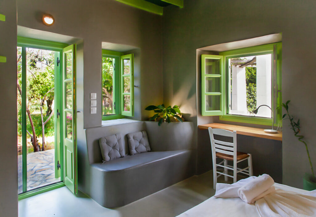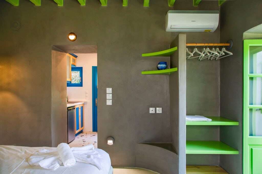Στόχος ήταν αφενός να αναδειχθεί μέρος του παραδοσιακού χαρακτήρα της Λέρου, και αφετέρου να συνδυαστεί με το φυσικό στοιχείο όσο το δυνατόν περισσότερο. Το κάθε δωμάτιο είναι της τάξεως των 18 τετ. μέτρων και περιλαμβάνει κουζίνα μπάνιο και το δωμάτιο με το διπλό κρεβάτι, αποθηκευτικούς χώρους, καθιστικό καθώς και γραφείο.